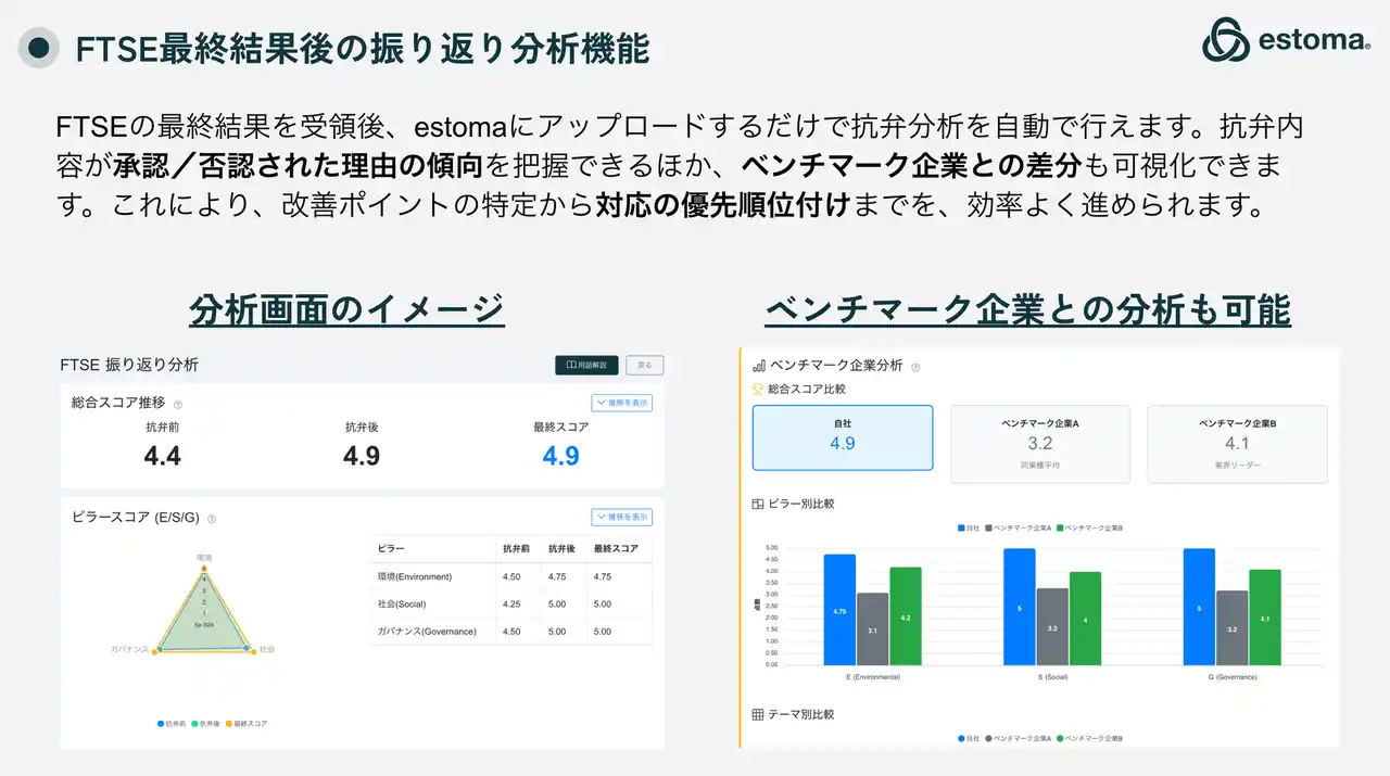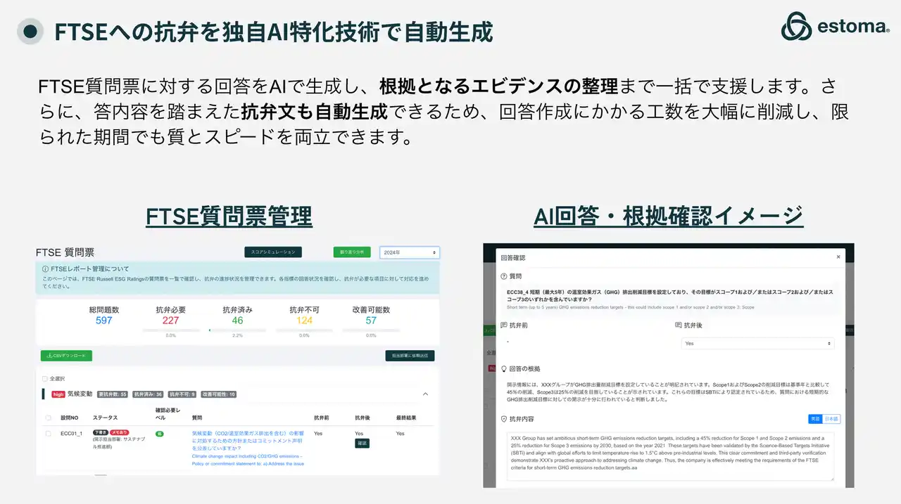 株式会社estoma(本社: 東京都千代田区、代表:伊藤総一郎)は、FTSE評価対応業務をAIで統合管理し、**工数を最大75%削減(当社試算)**しながら、提出前のスコア改善サイクルまで実現する新機能「FTSE対応統合管理ダッシュボード」の提供を開始しました。 従来、複数ファイルの手作業・部門横断の確認・英訳対応などにより数週間になりがちだったFTSE対応を、取り込み→優先順位付け→抗弁作成→日英切替→スコア予測→振り返り分析まで、1つの画面で完結させます。 |