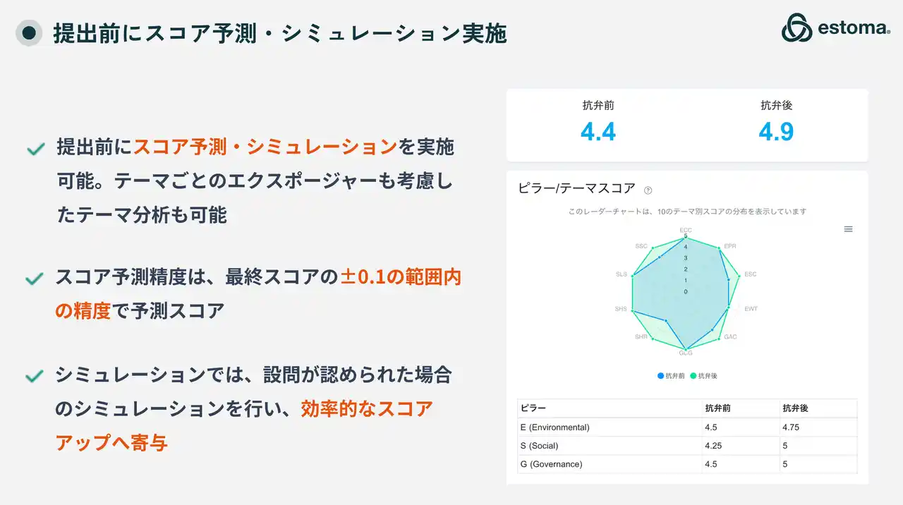 2)提出前にスコアを確認できるスコア予測 チェック操作でスコア変動を即時シミュレーション。Pillar(E/S/G)やTheme単位で、改善の当たりどころを特定し、提出前に改善サイクルを回せます。 |