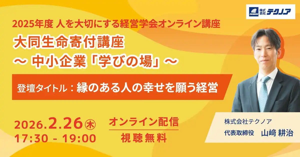 | 株式会社テクノア(本社:岐阜県岐阜市、代表取締役:山崎 耕治 以下、テクノア)の代表取締役 山崎が、2026年2月26日(木)に開催される「2025年度 人を大切にする経営学会オンライン講座 大同生命寄付講座~中小企業『学びの場』~」に登壇いたします。 | |||