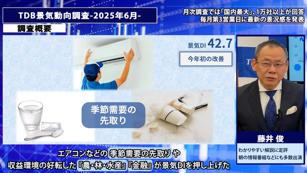本動画では、2025年6月の景気DI、業界別の動向、取材現場からの声、今後の景気のポイント、そして6月以降の景気の予測について最新のデータをもとに約5分で解説します。 |