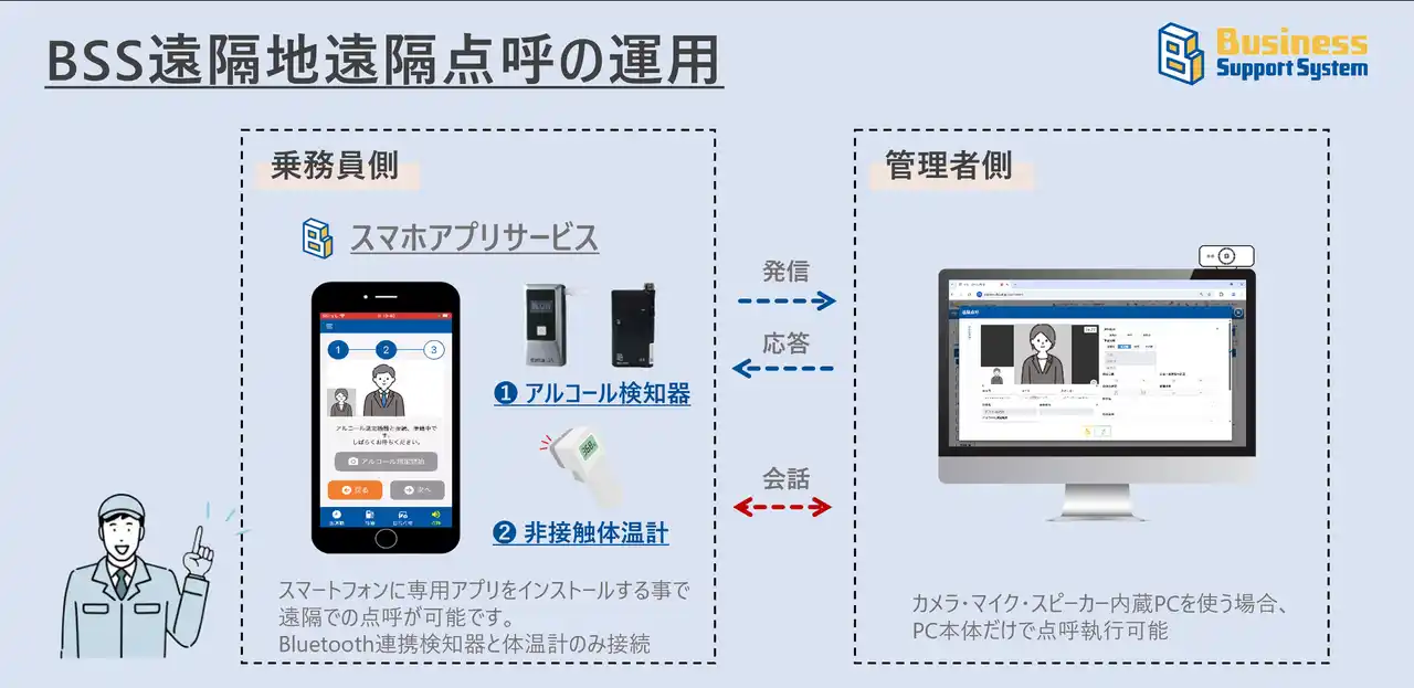 BSS遠隔地遠隔点呼では、以下必要機材をご購入頂きシステム運用することで複雑な要件を |