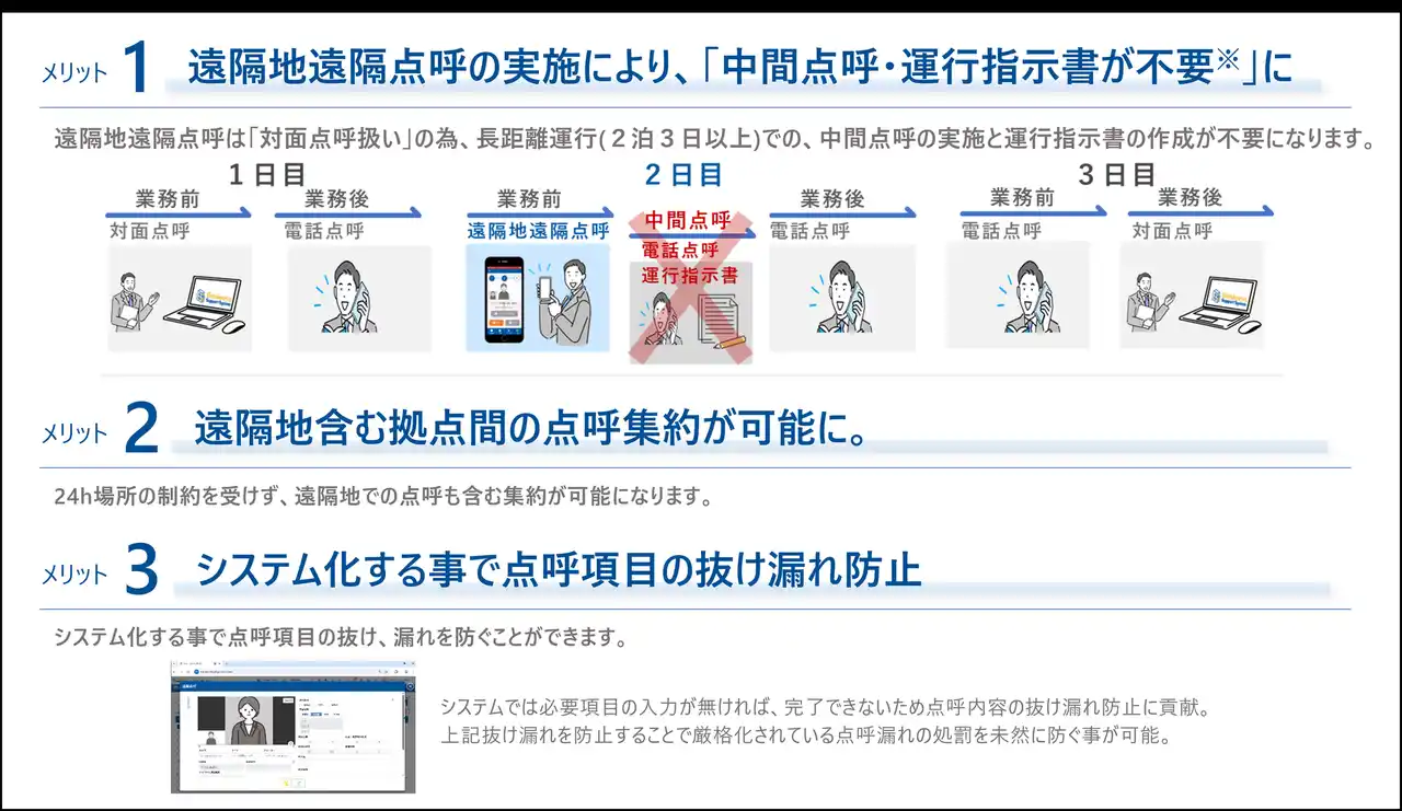 することで、小規模拠点の運行管理者様の点呼業務に掛かっていた負荷削減に大きく貢献します。 |