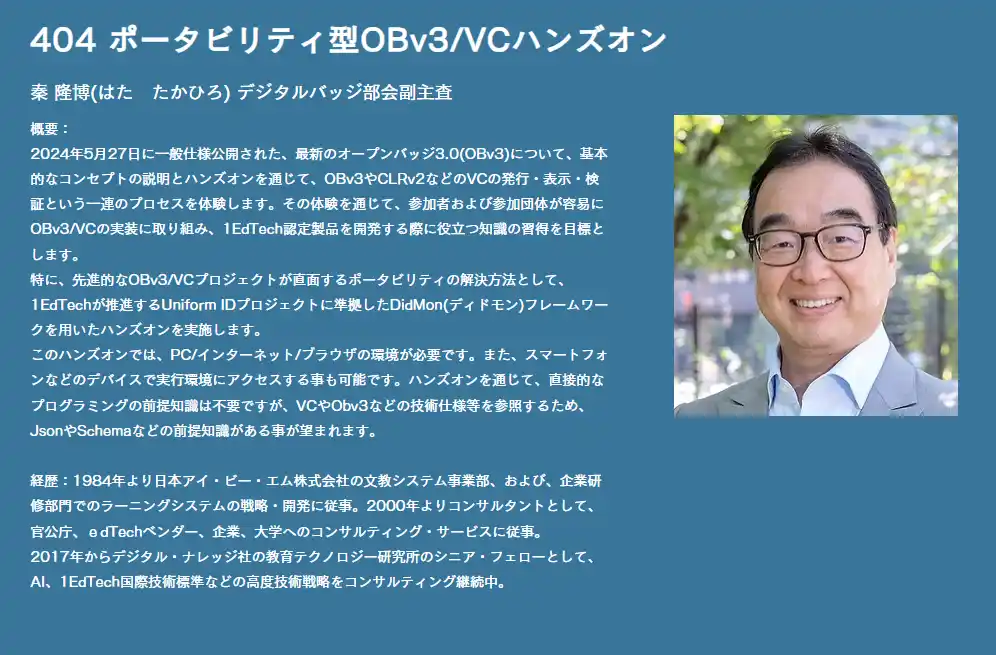 | 当社からは、7月31日(木)の「1EdTech Japan リーダーズトーク」に代表取締役社長 はが 弘明が登壇。また、8月2日(土)の「日本1EdTech協会の技術実践」には、デジタル・ナレッジ教育テクノロジ研究所 シニア・フェロー 秦 隆博(一般社団法人日本1EdTech協会 デジタルバッジ関連標準国内導入検討部会 副主査)が登壇いたします。 | ||||||||