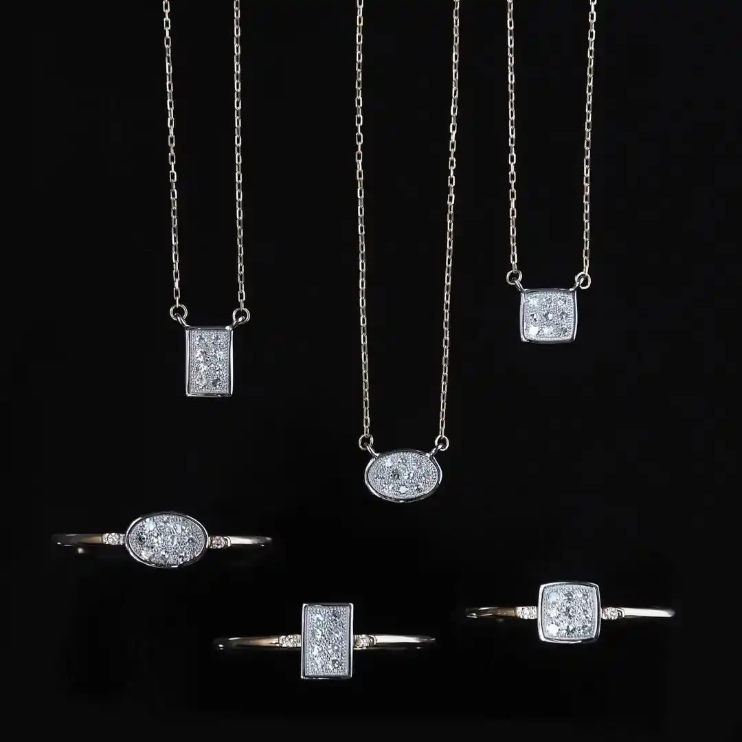 なお、「ルーチェ」シリーズにはペンダントのご用意もございます。リングと同様に五石の整列と三点留めの設計により、胸元に細やかな光の連なりを描きます。こちらもぜひ店頭でご覧ください。 |