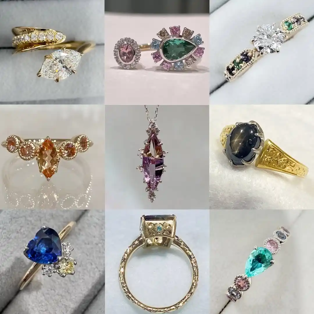 2月は、ブルーやグリーンを中心とした寒色系のバリエーションも順次ご案内いたします。色石の組み合わせや石種によって印象が大きく変わるため、一点ごとに異なる表情をお楽しみいただけます。 |