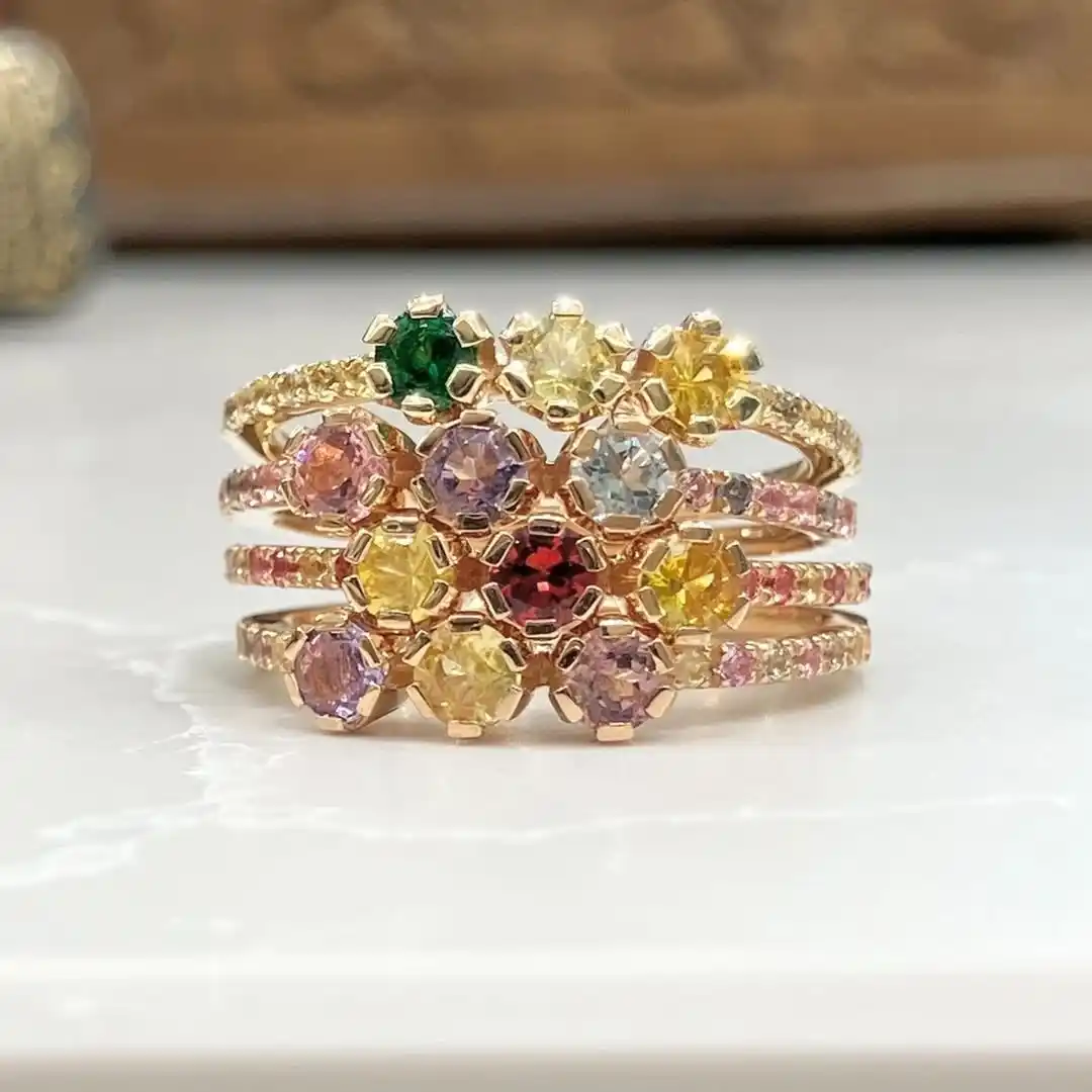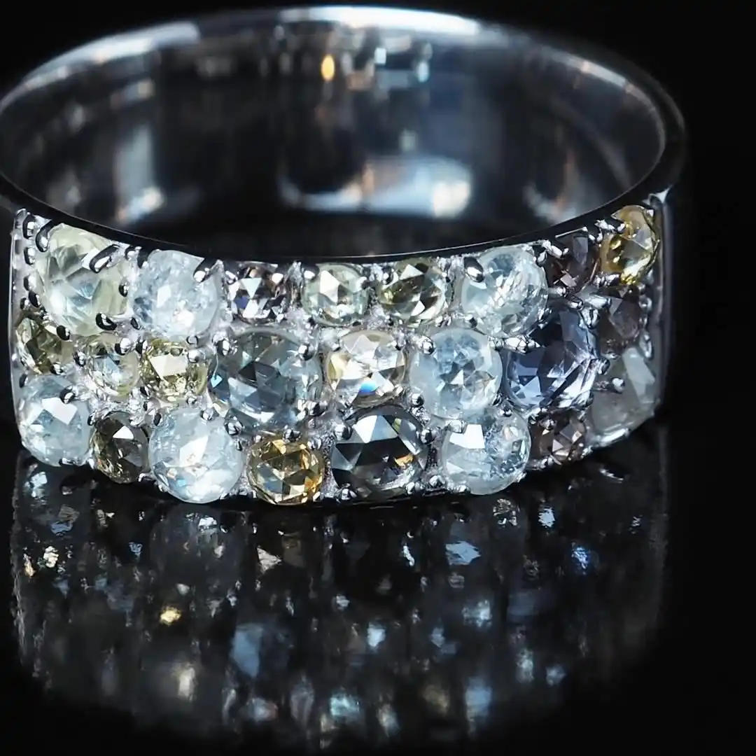 石座の高さを抑えた設計は、単体では静かな輝きを、重ね着けでは色彩の層を生み、指先に穏やかな光の連なりを描きます。