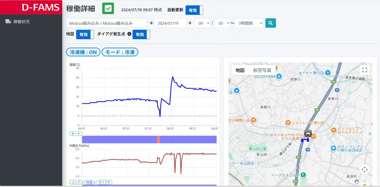 また、運用面での負担軽減を目的として、IoTサービス『D-FAMS』(※)のオプションサービス設定を検討しています。D-FAMSは車両の位置情報や温度データなどを遠隔で管理できます。またD-mobicoの送風停止や冷媒漏れ等の異常を検知することで、トラブルの原因特定や計画的な車両運行に貢献することを目指しているサービスです。 |