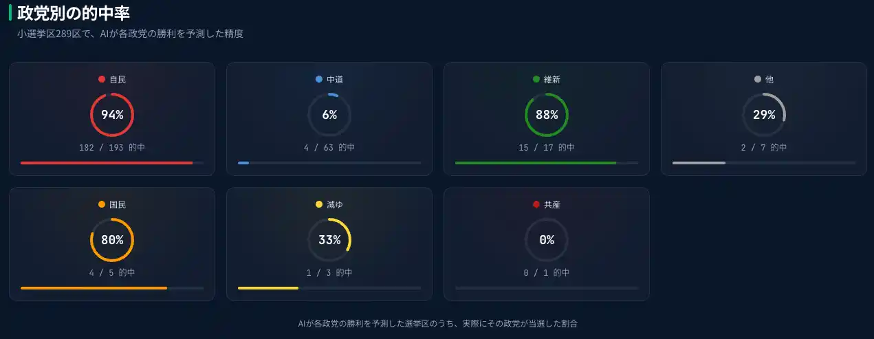 | AIによる分析と予想でしたが、最終的には大手メディアを変わらない予想となった一方で、自民党の躍進については想定以上、中道の衰退も想定以上と、なりました。 | |||