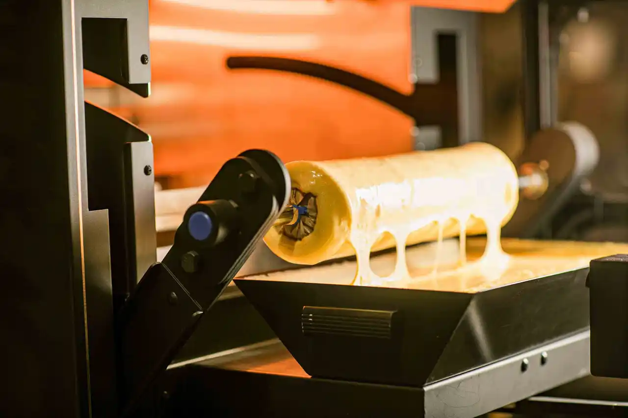 【焼き立てバウムクーヘン】 AI搭載の特別なマシンで、目の前で焼き上げるライブ感は、まるでスイーツショー。 立ち上る香ばしい香りと、焼き立てならではの温かさが、記憶に残るひと品です。 |