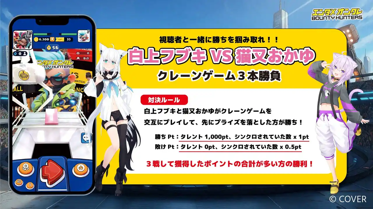 “推し”とシンクロするオンクレバトル「バウンティハンターズ」で、「ホロライブ」の人気VTuber『白上フブキ』『猫又おかゆ』とシンクロしてコラボプライズをゲットしよう!