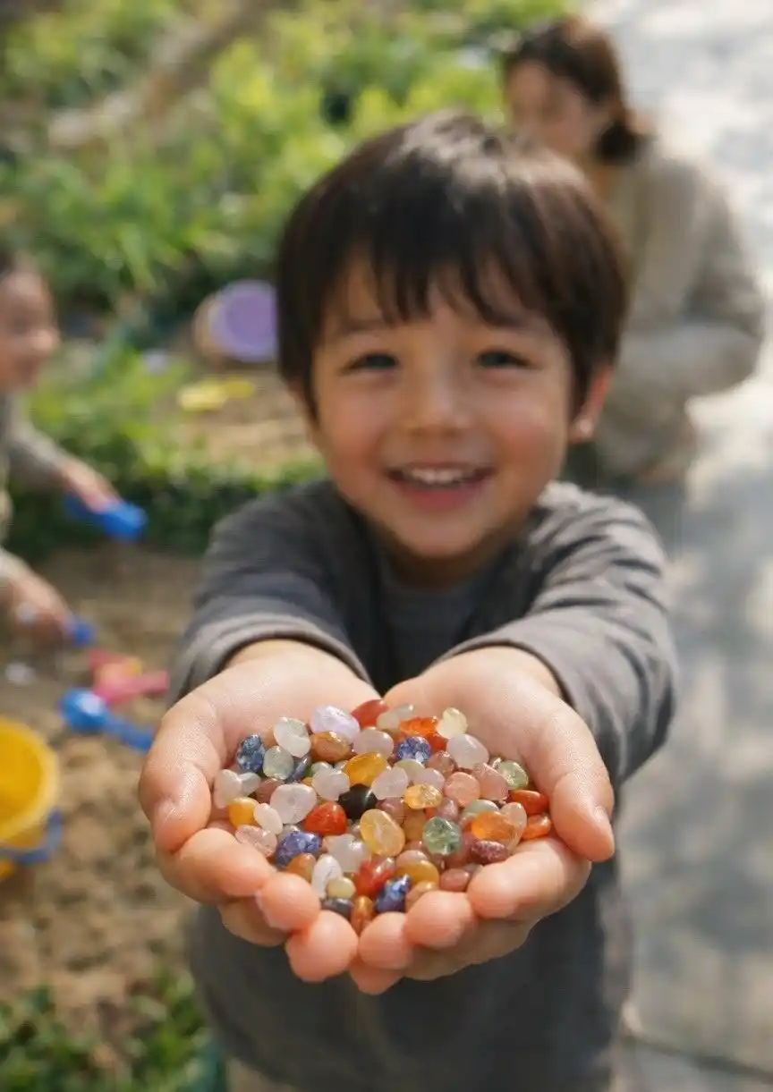 体験の舞台は、宝物が眠る砂でいっぱいの専用スペース。 スコップですくうたびに、砂の中から キラリと光る天然石や水晶、カラーストーン が現れます。 |