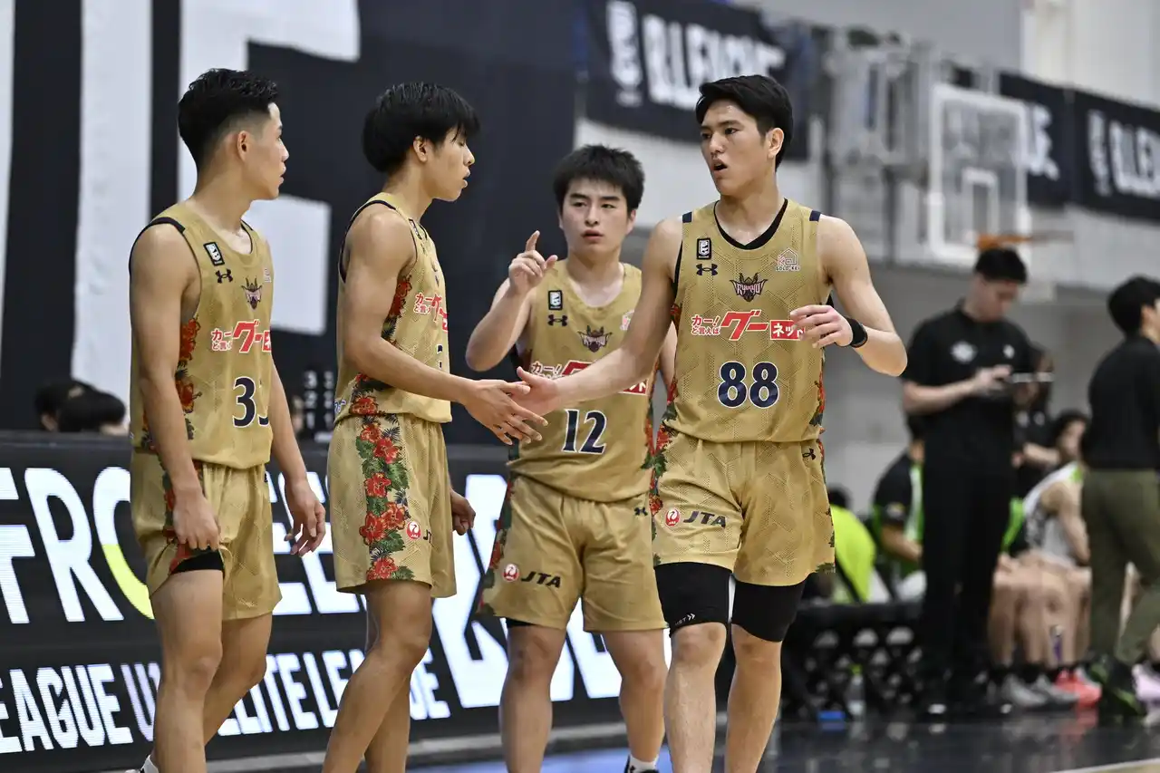 ホームでの全日程を終え、迎えた1月31日(土)第10戦の相手は滋賀レイクスU18です。3Pシュートと脅威のオフェンスリバウンドを誇る相手に対し、粘り強くディフェンスから流れを掴み、#29 宮里俊佑選手、#33 長嶺選手がそれぞれ23得点を記録しチームを牽引しました。結果は77-67で勝利を掴みました。 |