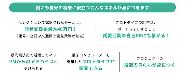 アウトプットプログラムでは、量子アニーリング技術を活用して動くWebアプリをデプロイすることを必須条件とし、社会課題を解決するソリューションの開発に挑戦します。開発にあたっては、専門知識を有するPMからのメンタリングを受けられるほか、開発支援金として最大40万円が支給され、量子コンピュータを活用したプロトタイプ開発を後押しします。 |