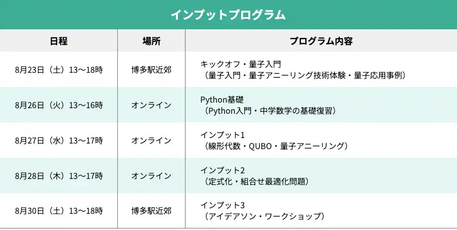 (1)インプットプログラム概要 量子コンピュータの中でも社会実装が始まりつつある量子アニーリング型を学ぶ内容になっています。学生の生活・学業との両立を考慮し、土日等を活用して全日程でも4~5日程度でリテラシーが身に付く実施方法ととなっています。また、Python基礎や数学の基礎は選択としています。 |