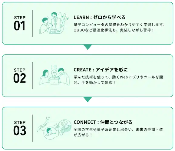 量子技術は今後の社会変革を支える重要な技術の一つですが、専門的な知識が必要とされるため、初学者が学習を始めるためのハードルが高いのが現状です。そのため、本プログラムでは以下のような 3 段階の育成ステップを設け、量子技術を学ぶハードルを下げつつ、未踏事業や起業・新規事業開発等を可能にする人材の育成を目指します。 |