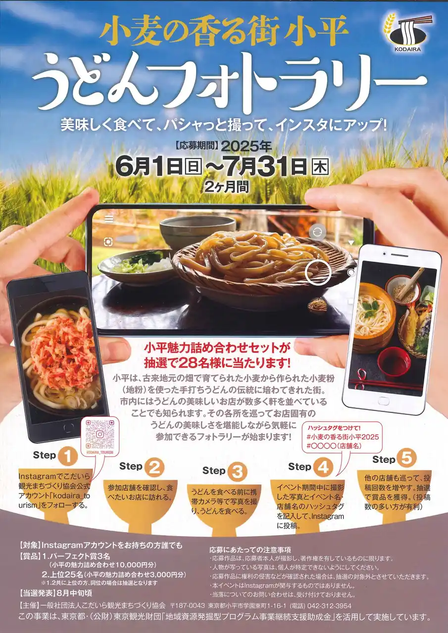 | 江戸期から小麦の栽培が行われ、うどん文化が伝わる小平市で、市内の店舗をめぐる「うどんフォトラリー」を開催中です。参加者には抽選で小平市の魅力を詰め合わせたセットが抽選で28名に当たり、投稿した店舗数が多いほど当選確率が上がります。奮ってご参加ください。 | |||||||||