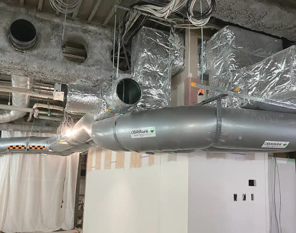 株式会社大林組(本社:東京都港区、社長:佐藤俊美)は、建物建設現場における熱中症対策の一環として、施工済みダクトに大型仮設空調機を接続させた仮設空調システム「建設現場"涼人(TM)(りょうじん)"プロジェクト」(※1)を構築し、7月上旬に東京都中央区日本橋のオフィスビル新築工事に適用しました。技能労働者の作業環境改善を目的に、完成建物の空調稼働前に全館空調を行う取り組みは建設業界初(※2)の試みとなります。 |
