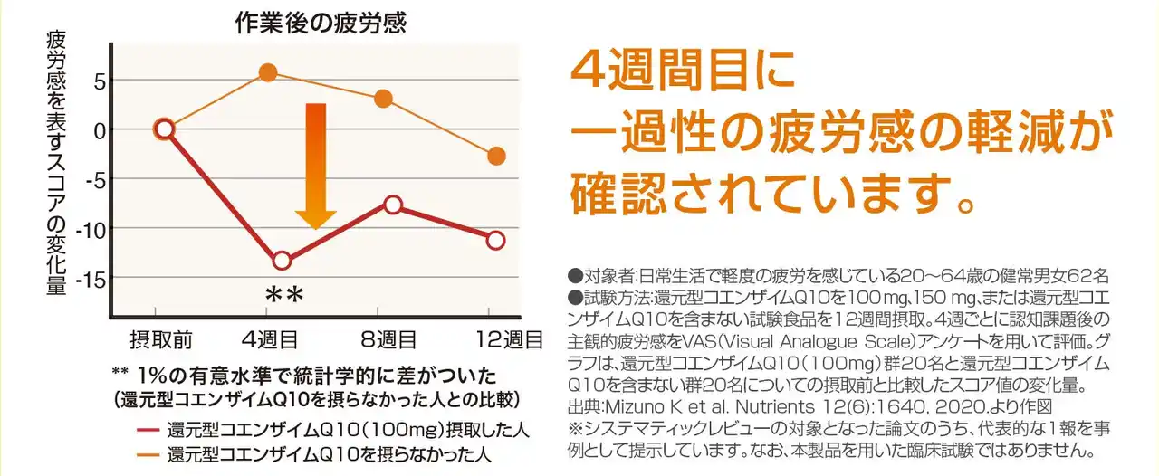 | 日常生活において軽度の疲労を感じている20~64歳の健常男女62名を対象に、還元型コエンザイムQ10を100mg、150mg、またはプラセボ※11を12週間摂取し、4週間ごとに認知課題後の主観的疲労感をVAS ※12アンケートを用いて評価する臨床試験において、還元型コエンザイムQ10 100mgを含む摂取群では、摂取前から摂取開始4週時点の主観的疲労感の指標の変化量がプラセボ群と比較して有意に低いという結果が得られています。 | |||||||