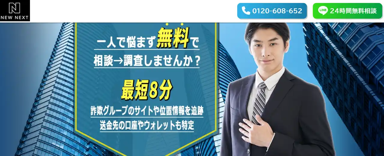 「その『おかしいな?』を、解決への一歩に変えませんか?」 詐欺被害の解決は、時間との戦いです。 「返金されるはずなのに連絡が途絶えた」「急に高額な手数料を請求された」 そんな不安を感じたら、すぐにニューネクストへご相談ください。 数多くの困難な案件を解決してきた専任の調査員が、親身になってお話を伺います。 あなたの未来を、これ以上誰にも奪わせないために。私たちは、最後まであなたの味方です。詐欺被害を最短8分で24時間無料調査|株式会社ニューネクスト【24時間無料相談】株式会社ニューネクストはロマンス詐欺、仮想通貨詐欺などの詐欺被害に対する24時間無料相談を提供し、専門new-next.net |