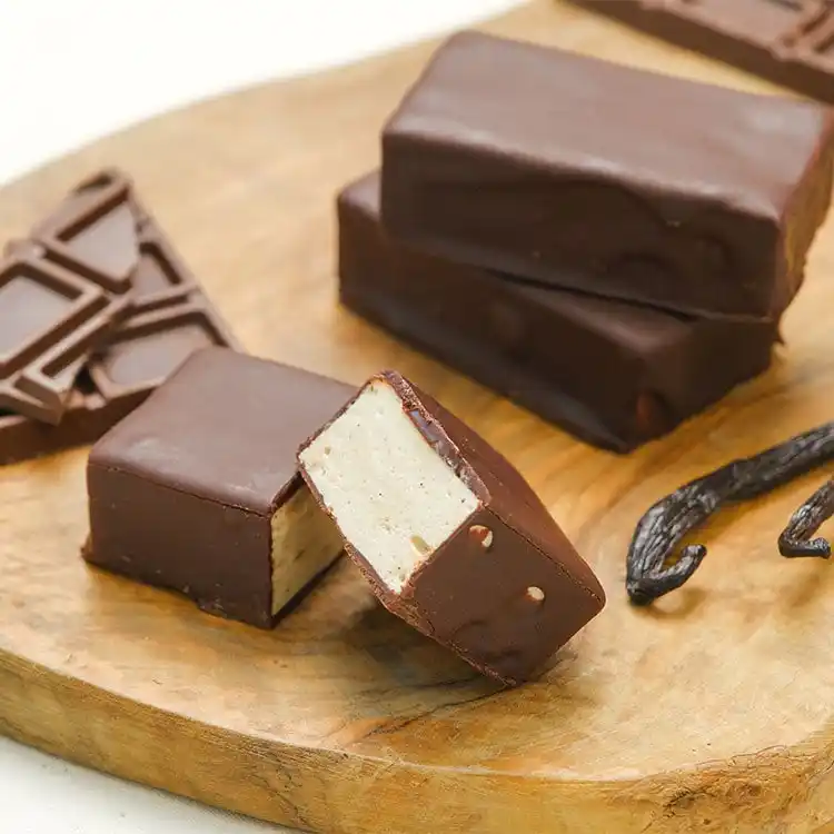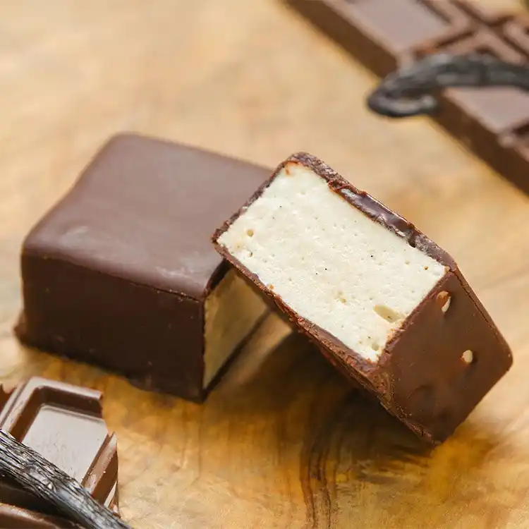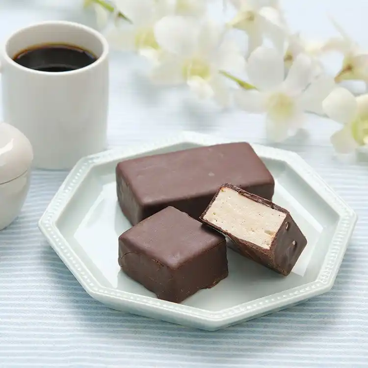 本製品は、ぱりっと割れる繊細なチョコレートの中から、もっちり軽いマシュマロが顔を出す、驚きのある食感が魅力のスイーツです。 |