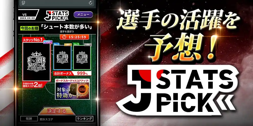実際の試合データと連動した予想参加型コンテンツ「J STATS PICK」は今シーズンも開催。 試合ごとに設定される「テーマ(お題)」に合わせて活躍が期待される選手を3名選出し、実際の試合データに基づいたスコアでランキングを競います。 予想を的中させて上位に入賞すると、豪華報酬や限定カードを獲得可能です。さらに、特定のカードを所持・設定することで獲得スコアがアップする「特効」機能も搭載。集めたカードを活用し、戦略的に試合予想を楽しみましょう。 |