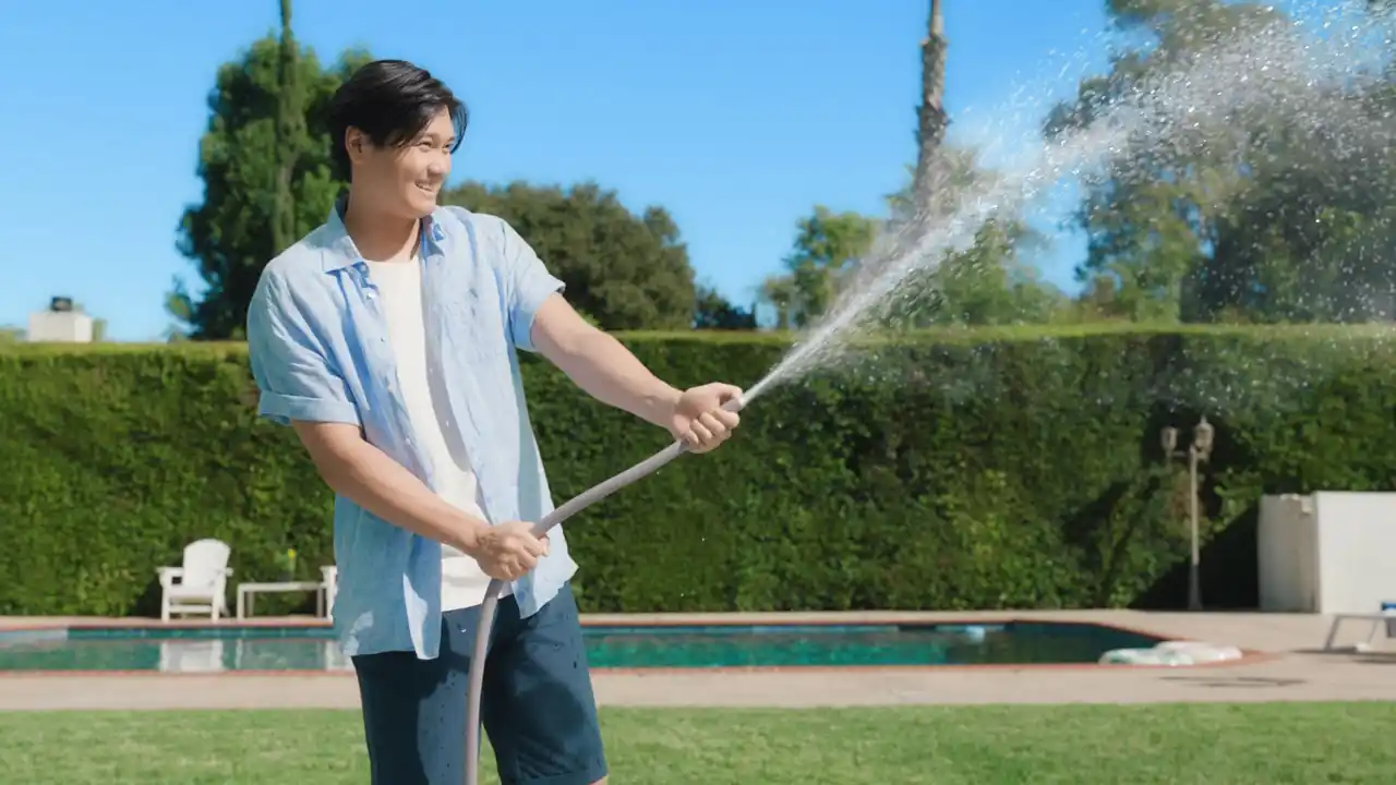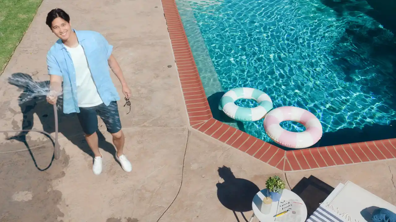 降り注ぐ日差しの下、庭でサングラス姿の大谷選手が豪快に水を撒くシーンからCMは始まります。 |