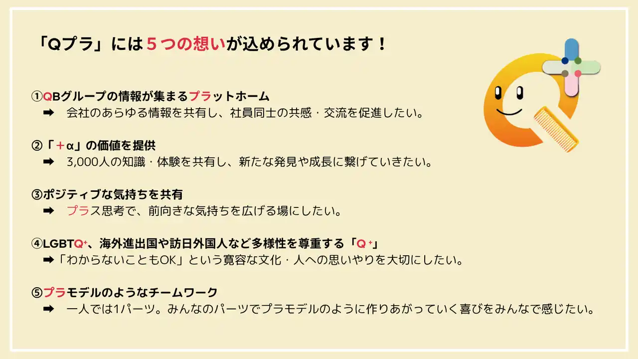 「Qプラ」は、「QBのプラットフォーム」「「+α」の価値を提供」「ポジティブな気持ち(プラス思考)を共有」といった意味を掛け合わせた名称です。“働く人”にとっての“プラス”になる存在として、今後さらに進化を続けていきたいという想いを込めました。 |