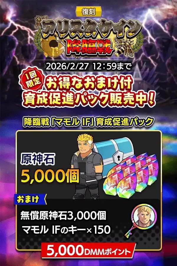 「復刻 アリスタケイン降臨戦」開催、「マモル IF」の登場を記念して原神石に加え、「マモル IFのキー」×150個が入手できてお得な「降臨戦「マモル IF」育成促進パック」と、「復刻アリスタケイン降臨戦スペシャルパック」も3種登場!こちらも是非お見逃しなく! |