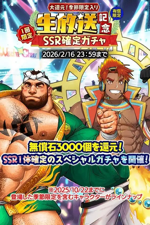 無償原神石3000個の還元に加え、SSR1体確定の『生放送記念 大還元!季節限定入りSSR確定ガチャ』、STEP5の10連ガチャでピックアップしたSSR1体が確定する『生放送記念 天使・悪魔、季節限定入りセレクトPU STEPUPガチャ』などオトクなガチャが開催! |