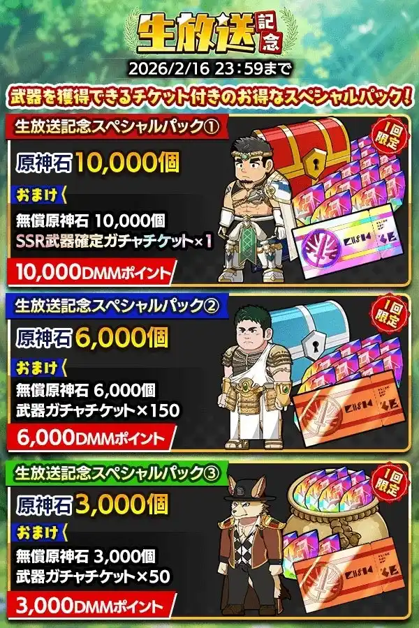 さらに、原神石に加え武器ガチャチケットが付いたオトクなスペシャルパックが3種登場!この機会をお見逃しなく! |