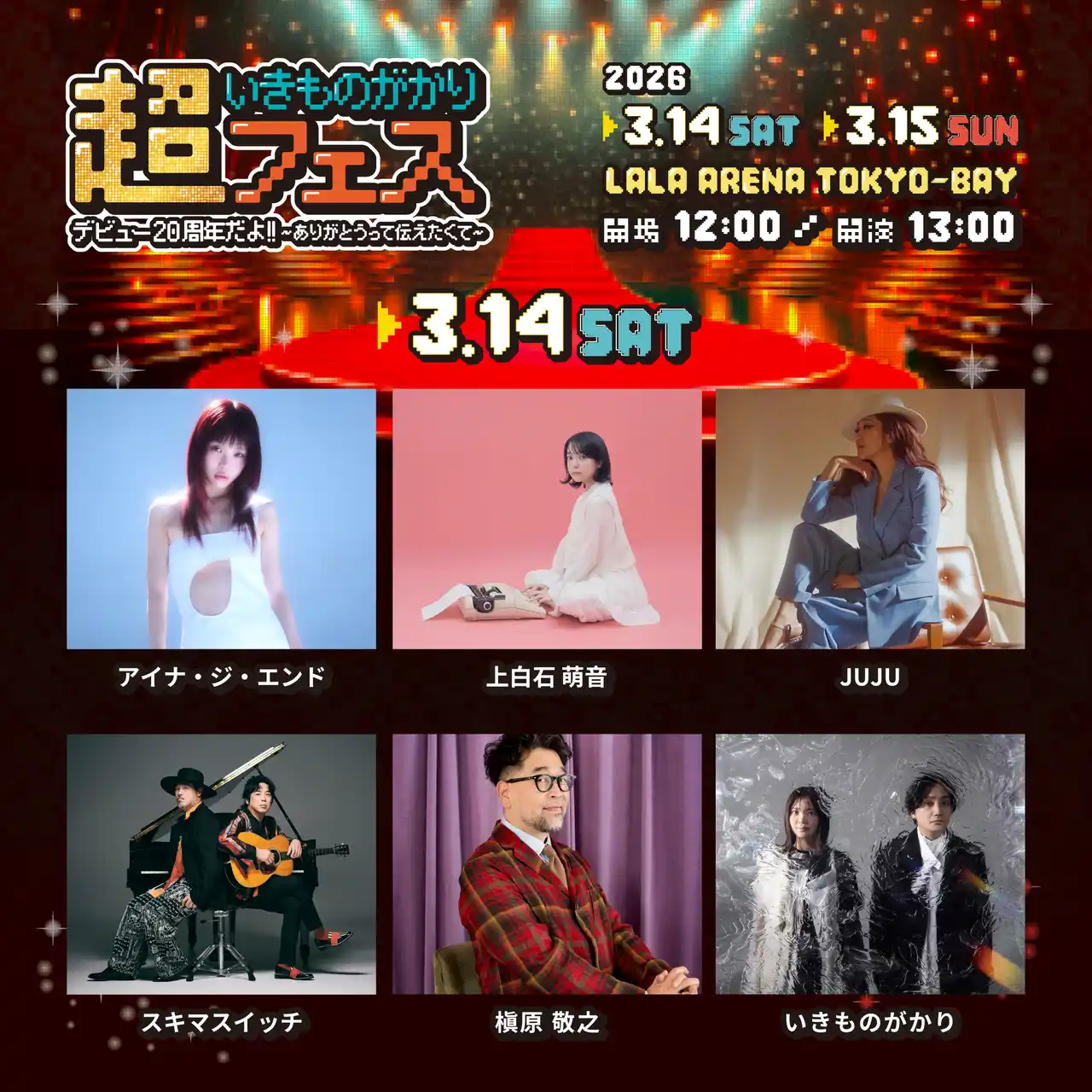 ▼3月14日(土)ラインナップ▼ [DAY1](五十音順) 出演:いきものがかり / アイナ・ジ・エンド / 上白石 萌音 / JUJU / スキマスイッチ / 槇原 敬之 |