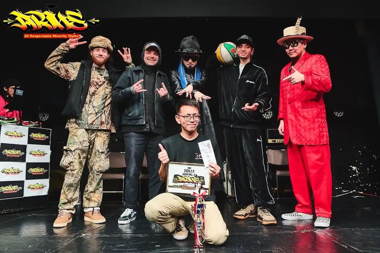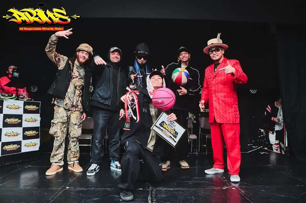 YUBINOWAとしての活動を中心にシーンを牽引し続ける源元(GENGEN)がオーガナイズ、ホストMCを務めました。 ジャッジには、精密なディジッツムーブで世界的評価を得るNARI Digitz(DARK MATTER)、USシーンを代表する前回 ARMS優勝者Wild Wild Wes(The Scared Gs / TEAMGOODTIME / ANIMATEDFAMILY)、世界のタットシーンのOGのIcon(Moon Runners)、フリースタイルバスケットボールの第一人者であり、圧倒的な身体操作で国内外から支持されるZiNEZ a.k.a. Kamikaze、そして唯一無二の世界観でダンス表現の枠を広げ続ける黄帝心仙人(タイムマシーン)が参加し、国際色豊かな強力ラインナップが揃いました。 |