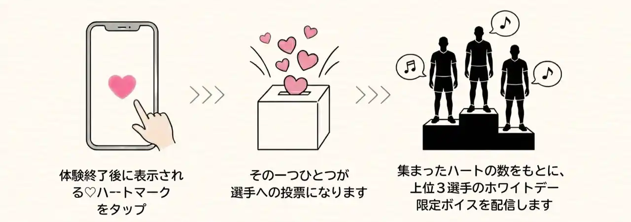 2月14日(土)~2月28日(土)の投票期間にタップされたハートマークの数を集計し、上位3名の選手を選出。選ばれた選手による「ホワイトデー限定ボイス」の配信を決定する、ファン参加型の投票企画を展開いたします。 |