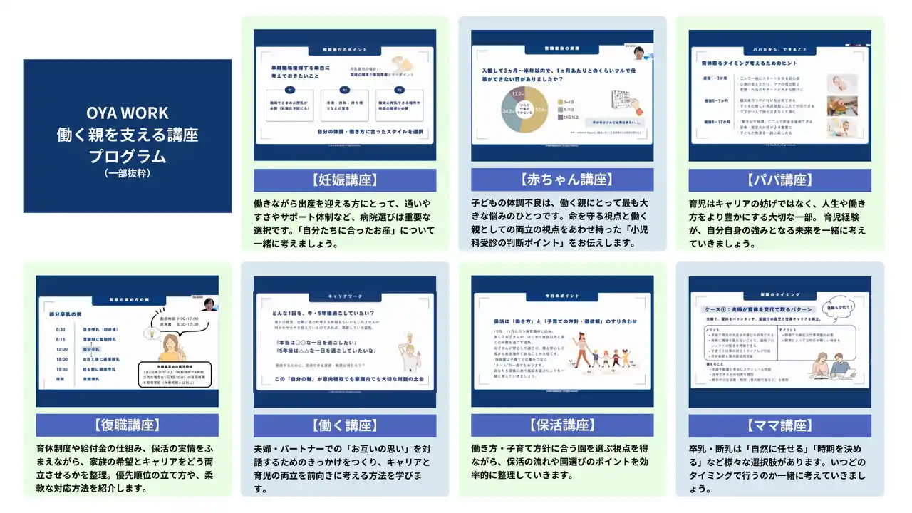 そうした現場の声から生まれたのが、働く親のためのオンライン両親学級「OYA WORK」です。 |