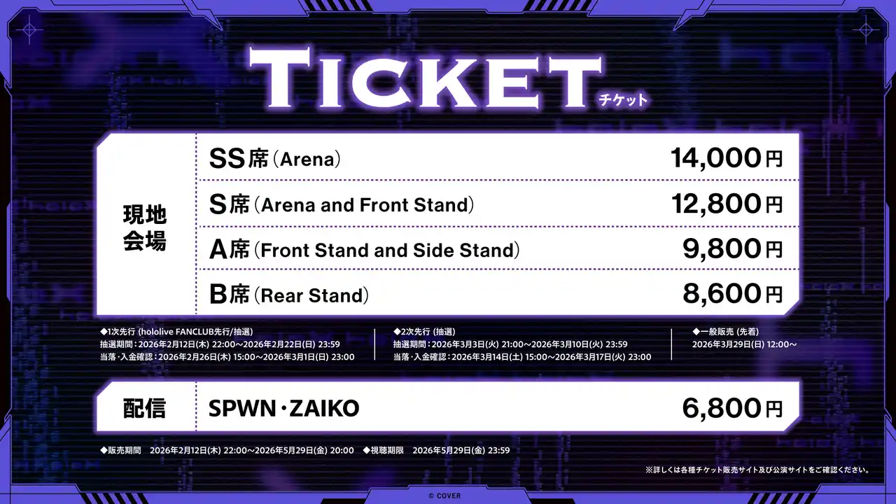 | 本日2月12日(木)より現地会場指定席チケットの1次先行(hololive FANCLUB先行 / 抽選)が開始とともに、「SPWN」「ZAIKO」にて配信チケットの販売が開始いたしました。 | |||||||||