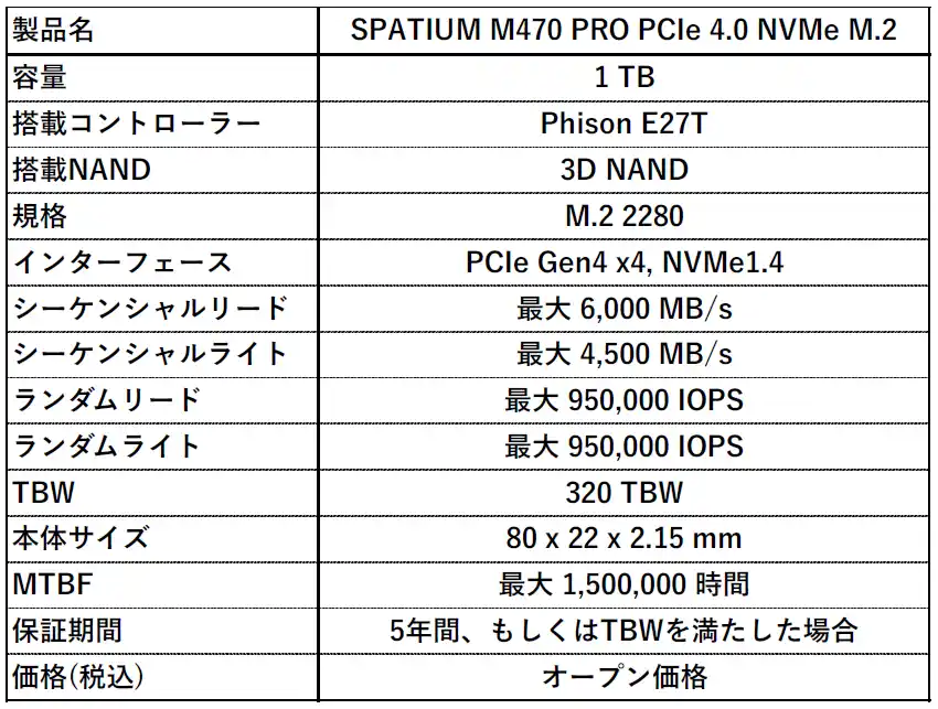 【SPATIUM M470 PRO PCIe 4.0 NVMe M.2 1TBの主な特徴】 |