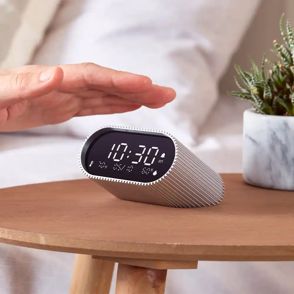 ピュアブラックの VA LCD ディスプレイを採用した、多機能デザインアラームクロック。温度・湿度センサーや複数のメロディを搭載し、快適な目覚めと穏やかな夜をサポート。 |