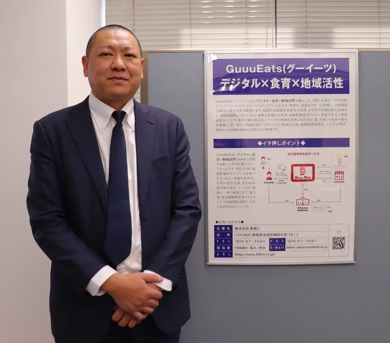(株)美喜仁では、アプリ「Guuu Eats」を開発。学校や企業の弁当希望者と飲食店のマッチングアプリで、アプリ上で、個人が前日までに飲食店に弁当を注文し、指定の場所に飲食店が配達するサービス。これによりフードロスが無く、家庭の弁当作りの負担を減らし、飲食店の事業継続を支援できる。令和8年4月から「群馬大学」と「ほっかほっか大将」による実証実験を桐生市にて行い、その後、群馬県内や全国展開していきたい。 |