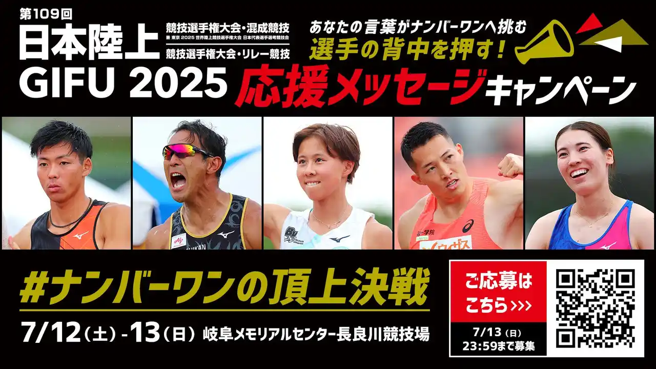 7月12日(土)~7月13日(日)の2日間、岐阜メモリアルセンター長良川競技場にて「第109回日本陸上競技選手権大会・混成競技」を開催いたします。 この度出場選手への「応援メッセージ」を大募集! 今大会は「東京2025世界陸上競技選手権大会」日本代表選手選考競技会を兼ねており、日本一が決定すると同時に世界への挑戦が始まる大会でもあります。 皆様からのメッセージは日本一、そして世界の舞台を目指して戦う選手たちにとって大きな力になるはずです! たくさんのご応募をお待ちしております。 |