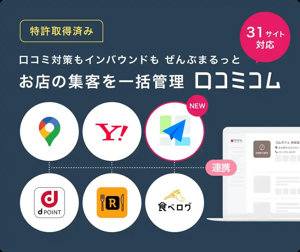 口コミコムは、国内外の口コミサイトを”もっと”売上に変える「店舗向け集客一元化プラットフォーム」です。 |