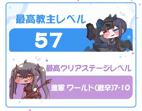 そうそう、教主たちも頑張ったじゃない! たった半月で、最高教主レベル「57」、最高クリアステージ「進軍 ワールド(激辛)7-10」だって! さっすが教主様ね! |