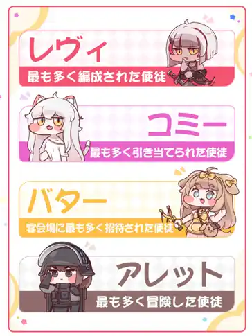 それから、登場が多かった「人気者」たちを発表しようかしら! ランクインしたのは、レヴィ、コミー、バター、アレットね! って、ちょっと、私が入ってないってどういうこと!?(地団駄を踏む) |