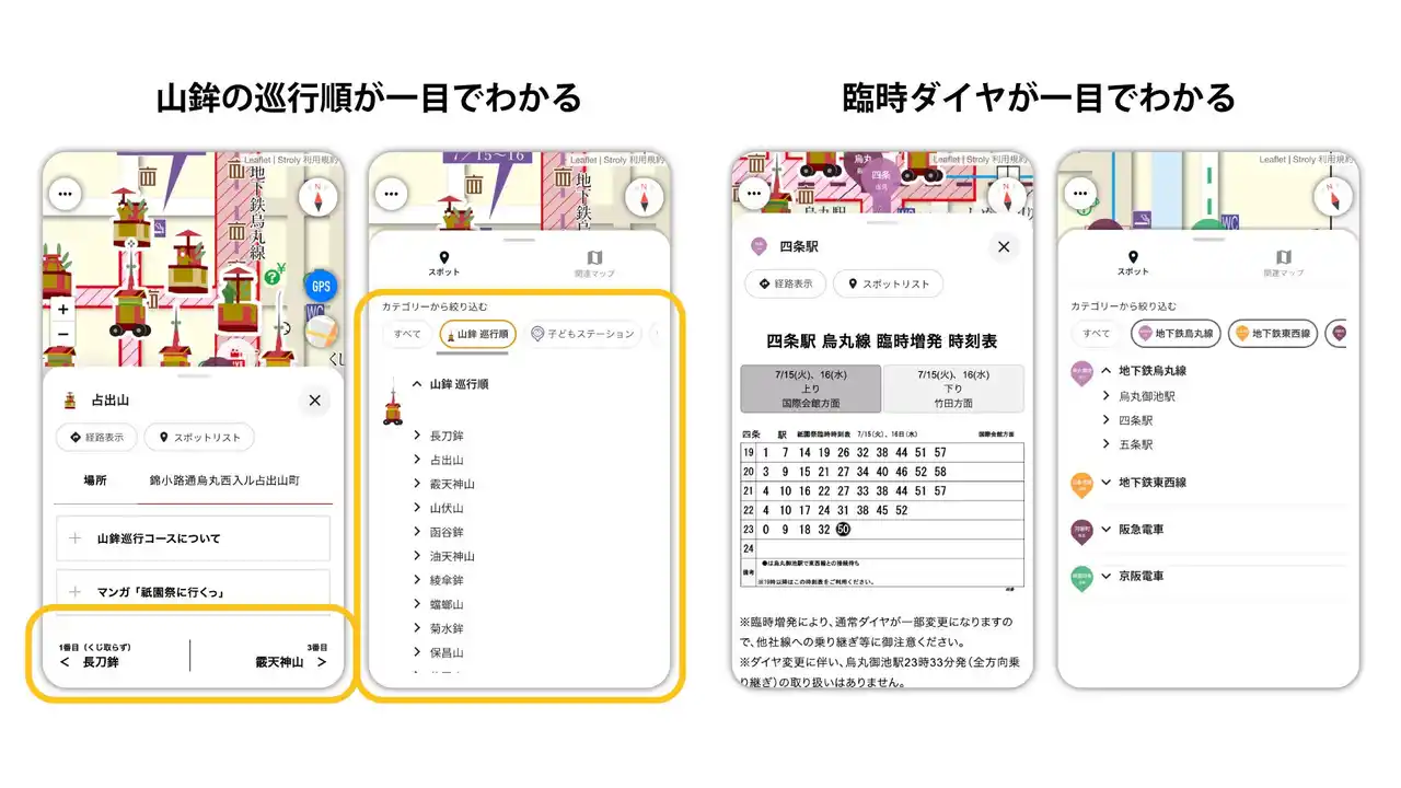 さらに今年は、山鉾の巡行順がひと目で分かるよう、マップ上のリストを巡行順に整理し初導入しました。各山鉾のスポットを選択すると、前後の山鉾情報へ遷移できる機能も昨年に引き続き実装しています。また、地下鉄の臨時運行情報も掲載し、移動の利便性向上を図っています。市営地下鉄については臨時時刻表まで表示し、京阪・阪急については案内テキストとリンクを設置予定です。 |