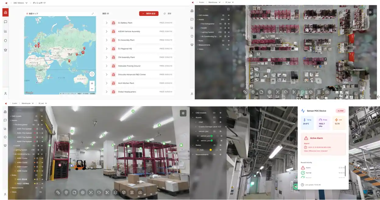 Kudan PRISMは、3D空間データを「部門単位で分断されたデータ」から「組織の資産」へ、そして「全社・全拠点で共有される経営基盤」へと進化させるプラットフォームです。「PRISM Cloud」と「PRISM Edge」を組み合わせることで、現場から経営層、ローカルからグローバルまでを一気通貫でつなぎ、デジタルツインの価値を最大化します。 Kudanは本プラットフォームを通じて、現場と経営をつなぐ空間データ統合基盤を構築し、分断された資産情報を統合された経営資源へと転換します。これにより、産業分野における高度な意思決定を支援するとともに、設備・インフラの維持管理効率化や技術継承のデジタル化といった構造的課題の解決を推進してまいります。 |