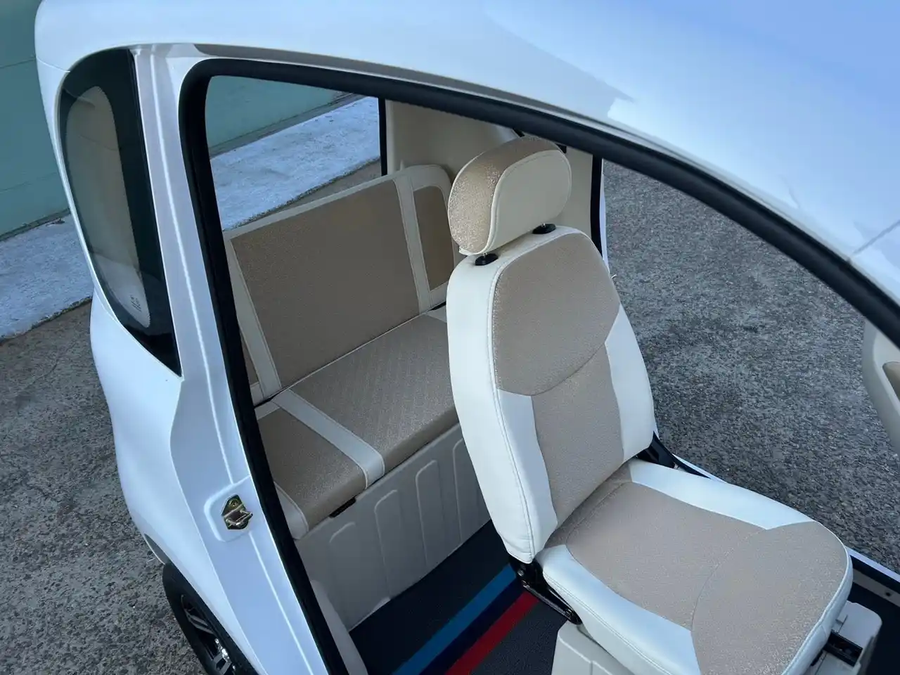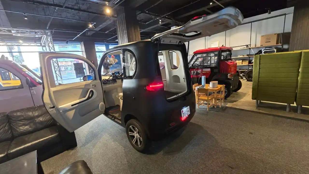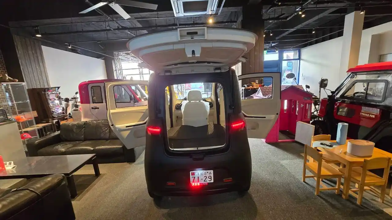 「VF-S」は100%電気で動くハッチバックタイプの三輪EVモビリティであり、登録はミニカー(1人乗り)または側車付軽二輪登録(3人乗り)。家庭用100Vのコンセントで充電が可能で、バッテリーも脱着式採用で、また後部座席はフルフラットになり荷物の210kgまで積載可能で、後ろから開けられるハッチバックタイプ。商業用営業車としても使い勝手が良く、ガソリン車からの切り替えにより車検車庫証明不要でコストダウン効果も期待でき、企業や団体向けの需要にも対応。