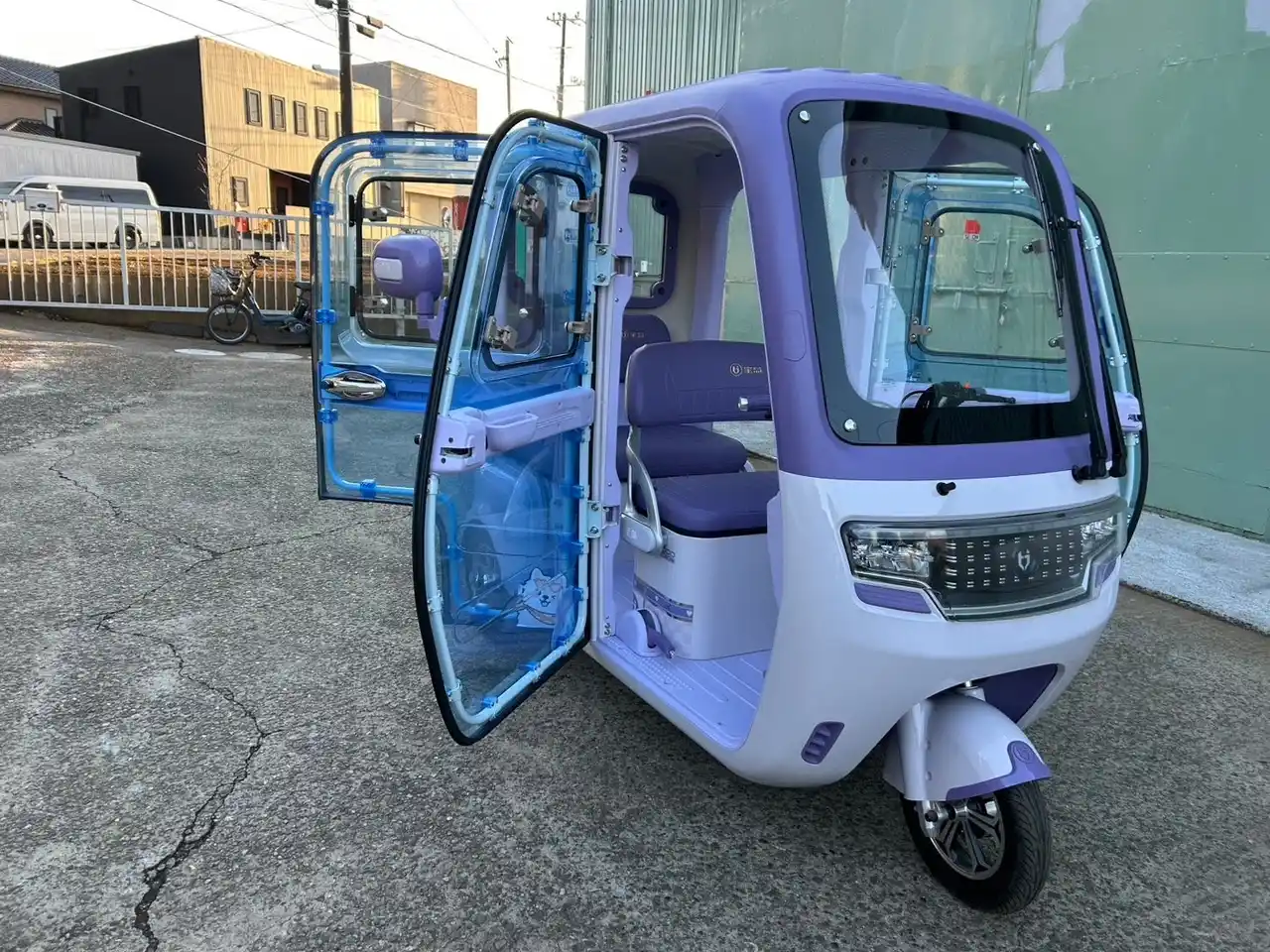 また、車内でバッテリーからの電源を使用し要冷商品等を保冷庫に入れて運搬することも可能でき、スポットエアコンを始め、電気毛布やヒーターなども設置可能で快適に移動できる。(別売りのアップボルトインバータ使用)。「VF-C」は車体左右にドアが2枚ずつある観音開きタイプの三輪EVで、ドアは透明アクリル製で車内に採光が入り明るく、近所の買い物や子供からお年寄りまでの送り迎えにピッタリ。