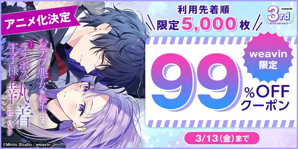 【アニメ化&出版社weavin3周年記念!99%OFFクーポン】キャンペーン実施中! |