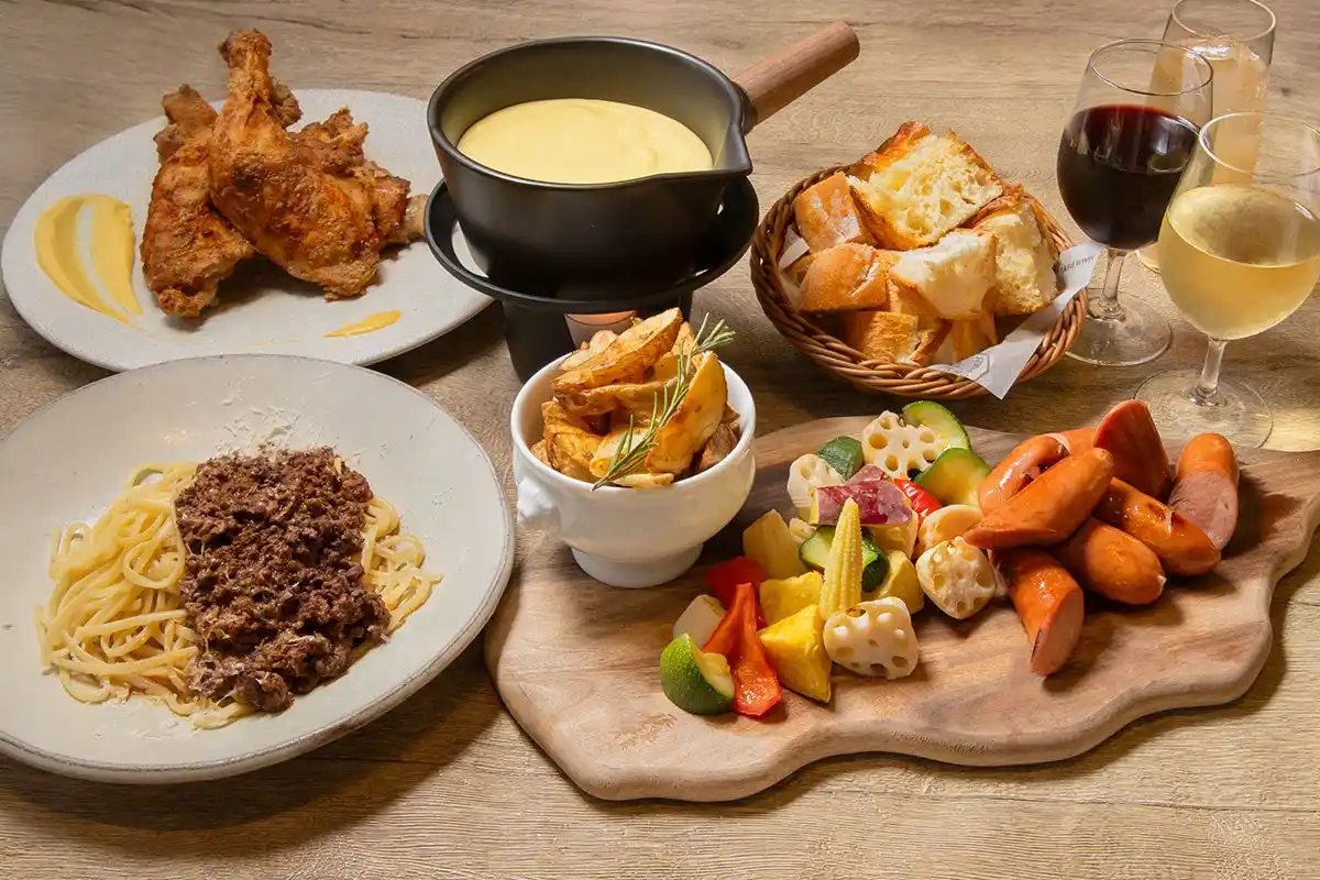 ・チ ーズフォンデュソース ・じっくり煮 込 ん だ 淡路産牛のボロネーゼ(※淡路島産牛50%使用) ・ローストチキン ・バゲット&フォカッチャ ・ロースト野菜 ・フライドポテト ・グリルソーセージ |
