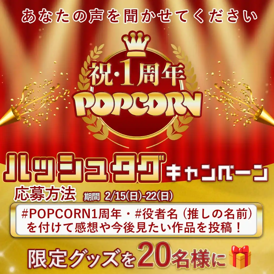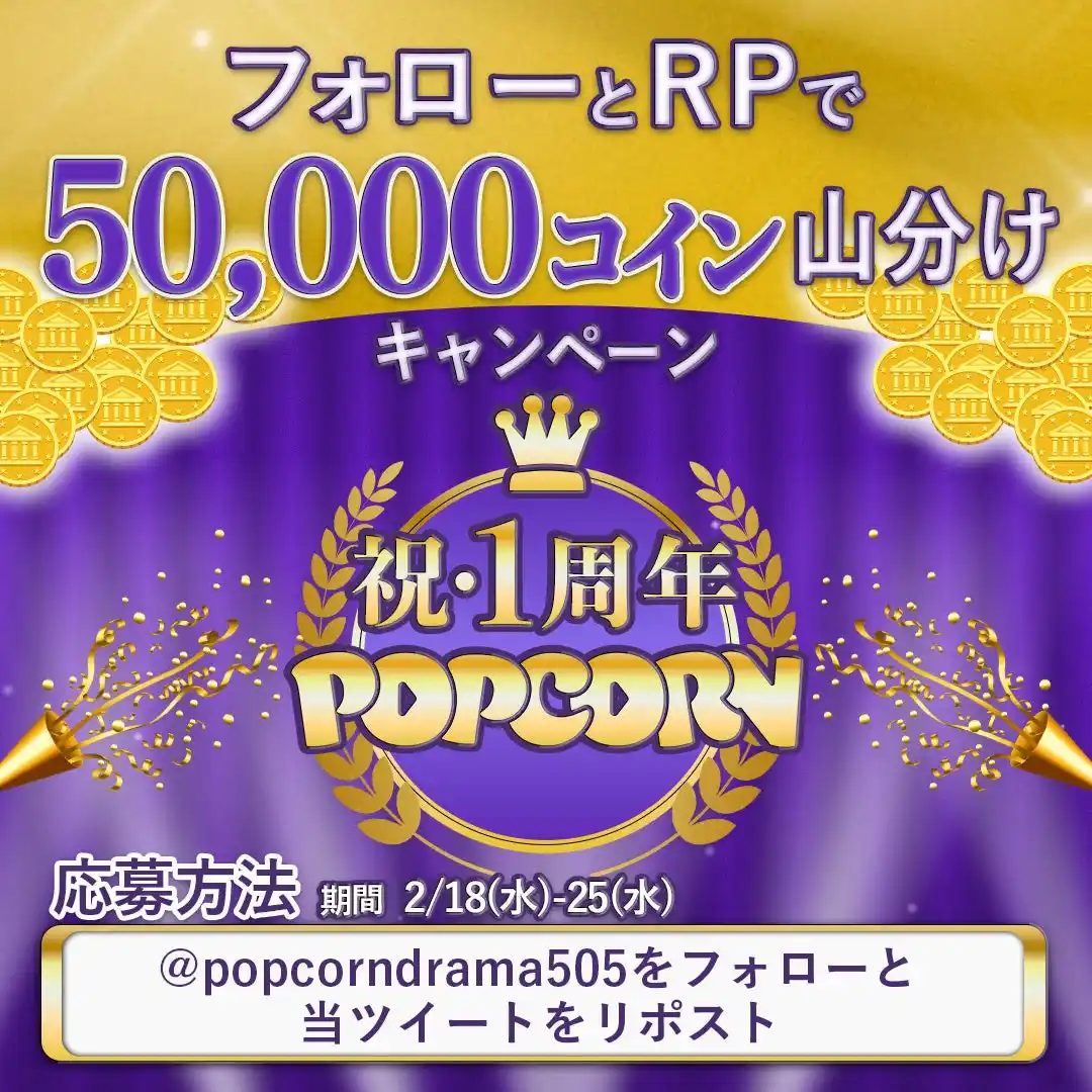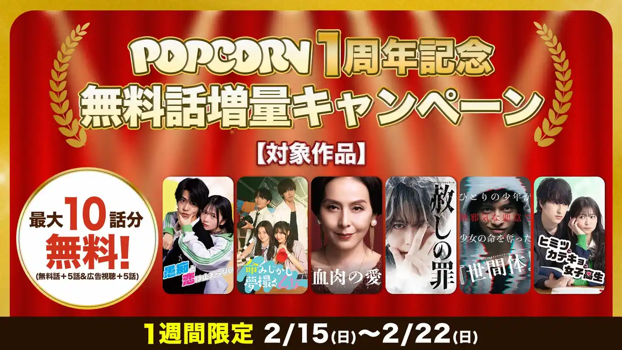 スマホ特化型短尺ドラマプラットフォーム「POPCORN」は、本日2026年2月15日をもちまして、サービス開始から1周年を迎えました。これを記念し、日頃の感謝を込めて「POPCORN IMPACT: 一粒の衝撃が、一生モノの物語に変わる。」をテーマとした4つのキャンペーンを実施いたします。