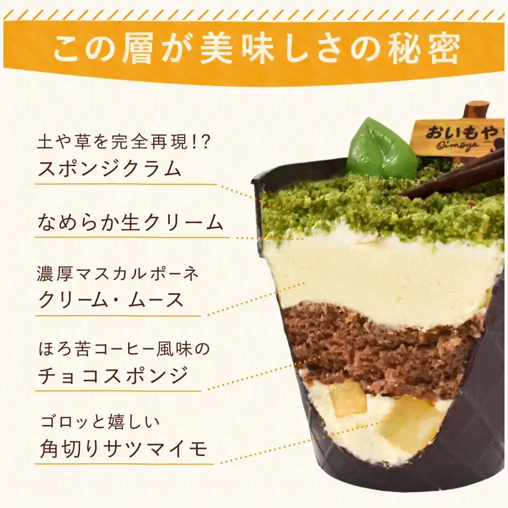 お芋ほりのわくわくや楽しみをお家でも感じてほしい!そんな想いから誕生したのが「芋ほりティラミス」。緑と黒のスポンジクラムでおいも畑のようなリアルな土や草を表現。掘り進めていくと中には角切りのさつまいもが♪お家でさつまいもの収穫体験を楽しめる体験型スイーツです。 |